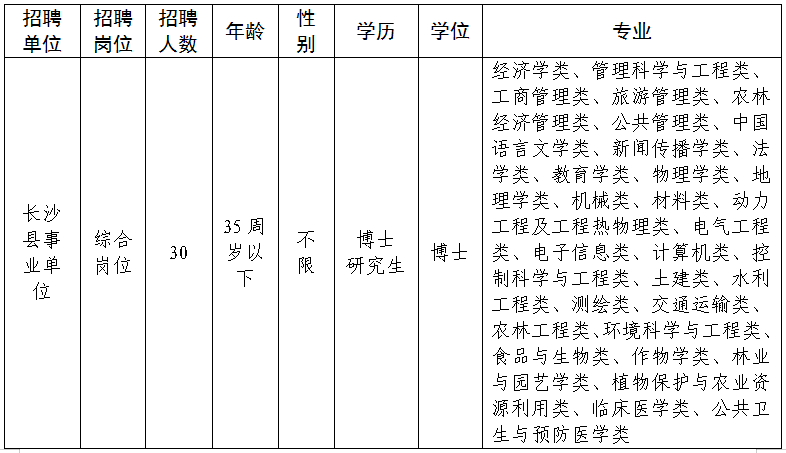 为奋力推进“三高四新”战略,加快打造近悦远来人才高地,为长沙县未来发展储备培养一批高素质专业化人才,根据《事业单位人事管理条例》(国务院令第652号)和《湖南省事业单位公开招聘人员办法》(湘人社发〔2019〕1号)等文件要求,决定面向社会公开招聘30名具有博士研究生学历、学位的高层次人才,现将有关事项公告如下: